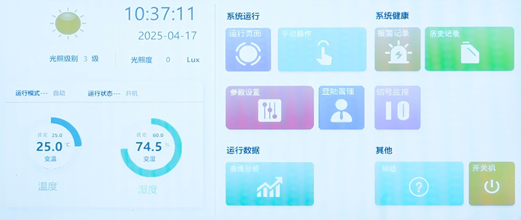集成保溫潔凈系統(tǒng)、溫恒濕系統(tǒng)、新風(fēng)系統(tǒng)、滅菌系統(tǒng)、精準(zhǔn)氣流組織系統(tǒng),結(jié)合工業(yè)級(jí)傳感網(wǎng)絡(luò)及智能控制系統(tǒng)實(shí)時(shí)監(jiān)測并調(diào)節(jié)溫度、濕度、CO?濃度、風(fēng)速等參數(shù),確保環(huán)境參數(shù)穩(wěn)定匹配作物生長需求。